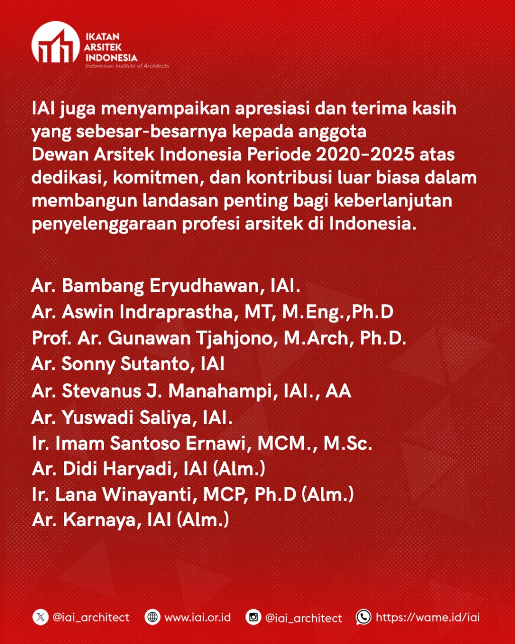 | 9 | 16 September 2025 | Berdasarkan Anggaran Rumah Tangga (ART) IAI Tahun 2024 Pasal 76; disebutkan bahwa Pengajuan sekurangkurangnya 10 nama Bakal Calon Anggota DAI unsur IAI. Ketetapan Rakernas Nomor: 01/TAP/RAKERNAS/IX/2025 menetapkan 24 (dua puluh empat) nama Calon Dewan Arsitek Indonesia dari unsur IAI. |
