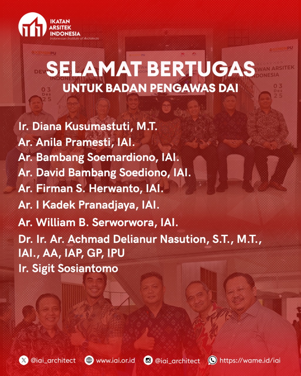 | 17 | 15 November 2025 | Penyampaian Hasil Seleksi Dewan Arsitek Indonesia Periode 2025-2030 kepada Menteri Pekerjaan Umum Republik Indonesia. |
