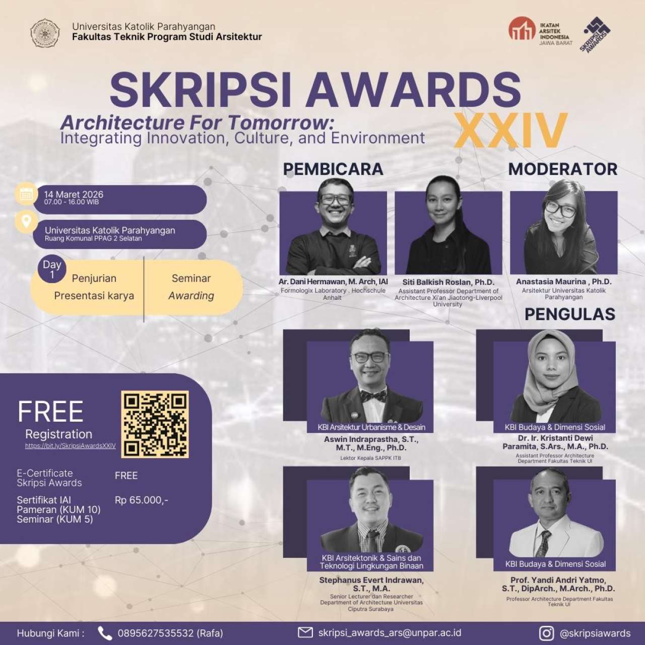Skripsi Awards merupakan agenda rutin yang diadakan setiap semester oleh Fakultas Teknik UNPAR sebagai bentuk apresiasi akademik kepada mahasiswa yang meraih capaian nilai skripsi tertinggi sekaligus menunjukkan kualitas penelitian yang unggul. Pada tahun 2026, acara ini akan dilaksanakan secara luring dan mencakup karya terbaik dari semester ganjil tahun akademik 2025/2026. Rangkaian kegiatan meliputi proses penjurian melalui presentasi singkat berdurasi tiga menit (three minutes thesis), penyelenggaraan instalasi pameran karya skripsi terpilih, serta seremoni penganugerahan penghargaan bagi peserta terbaik. Proses penilaian dilakukan secara objektif dengan melibatkan reviewer eksternal dari kalangan akademisi yang memiliki keahlian sesuai bidang Kelompok Bidang Ilmu (KBI), serta berasal dari luar Program Studi Arsitektur UNPAR guna menjamin kredibilitas, transparansi, dan kualitas seleksi.