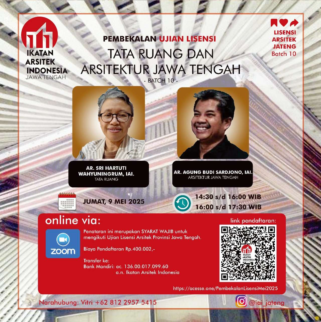 IAI Jawa Tengah akan mengadakan Pembekalan Lisensi Arsitek Jawa Tengah yang akan dilakukan secara online.