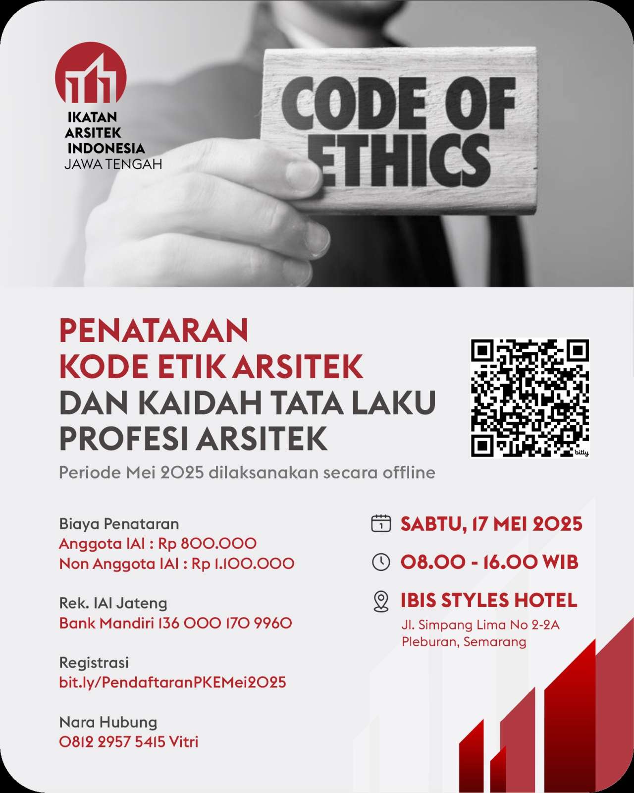 IAI Jawa Tengah akan mengadakan Penataran Kode Etik Dan Kaidah Tata Laku Profesi Arsitek yang akan dilakukan secara offline.