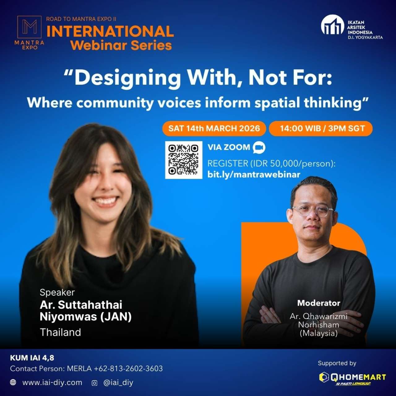 Kegiatan ini merupakan webinar internasional yang diselenggarakan oleh IAI Chapter Yogyakarta dengan menghadirkan Ar. Suttahathai Niyomwas (Jan), co-founder City Connext. Webinar mengangkat tema “Designing With, Not For: Where Community Voices Inform Spatial Thinking” yang membahas pendekatan community-centric design dalam praktik arsitektur dan perancangan kota. Kegiatan dilaksanakan dalam bentuk pemaparan materi oleh narasumber yang dilanjutkan dengan sesi diskusi interaktif bersama peserta.