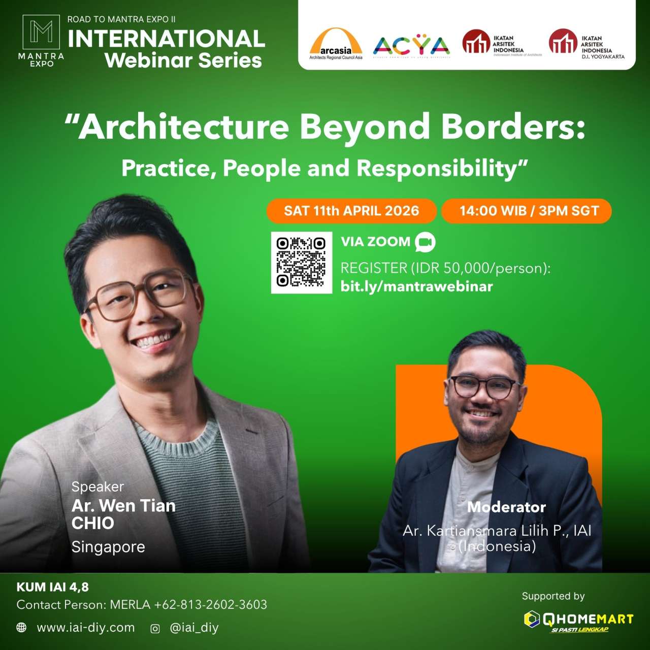 Webinar ini merupakan bagian dari rangkaian Road to Mantra Expo 2026 yang menghadirkan Ar. Chio Wen Tian sebagai pembicara utama. Kegiatan dilaksanakan secara daring dalam bentuk presentasi dan diskusi interaktif yang membahas pengalaman profesional, proyek berbasis komunitas, serta peran arsitek dalam membangun ekosistem kolaboratif. Peserta terdiri dari arsitek, akademisi, mahasiswa, dan praktisi terkait yang berkesempatan untuk berdialog langsung dengan pembicara.