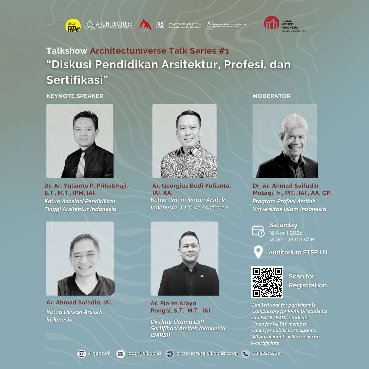 Talkshow Architectureuniverse Talk Series #1 merupakan forum diskusi interaktif yang membahas keterkaitan antara pendidikan arsitektur, praktik profesi, dan sistem sertifikasi arsitek di Indonesia. Kegiatan ini menghadirkan narasumber dari berbagai pemangku kepentingan, yaitu Ar. Ahmad Saladin, IAI (Ketua DAI), Dr. Ar. Yulianto P. Prihatmaji, S.T., M.T., IPM, IAI (Ketua APTARI), Ar. Pierre Albyn Pongai, S.T., M.T., IAI (Direktur Utama SARSI), serta Ar. Georgius Budi Yulianto, IAI, AA (Ketua Umum IAI – to be confirmed).