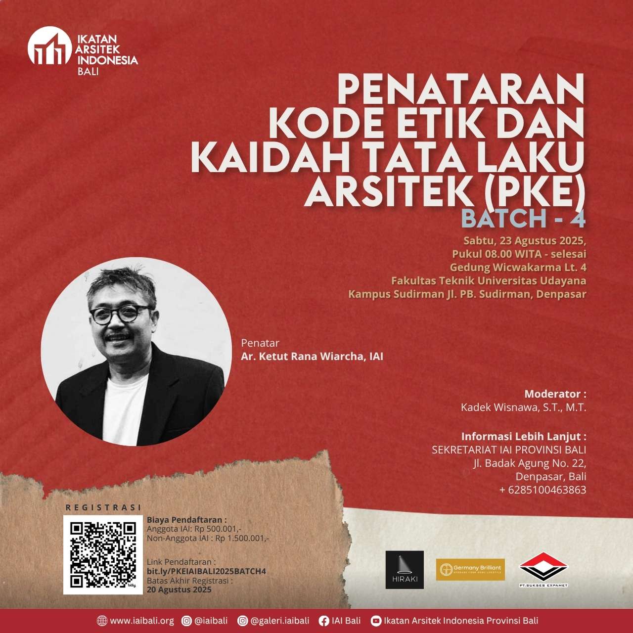 Penyelenggaraan Penataran Kode Etik Arsitek & Kaidah Tata Laku Profesi dilaksanakan oleh IAI Provinsi Bali di Merdeka Tower Bussines Centre (Warmadewa College). Penataran Kode Etik Arsitek & Kaidah Tata Laku Profesi ini dilaksanakan secara rutin dalam rangka mengakomodasi calon anggota dalam pemahaman etika berprofesi arsitek