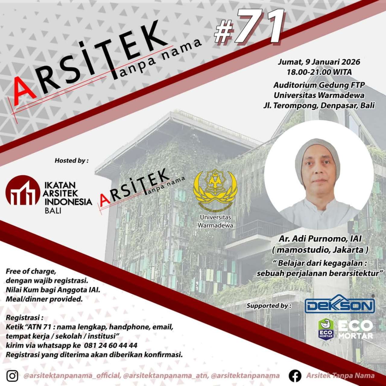 Note : Venue dibuka mulai 5pm di Gedung FTP Unwar untuk Open House Prodi Arsitektur Unwar + display Pameran Karya ATN, dilanjutkan mulai 6pm untuk acara ATN.