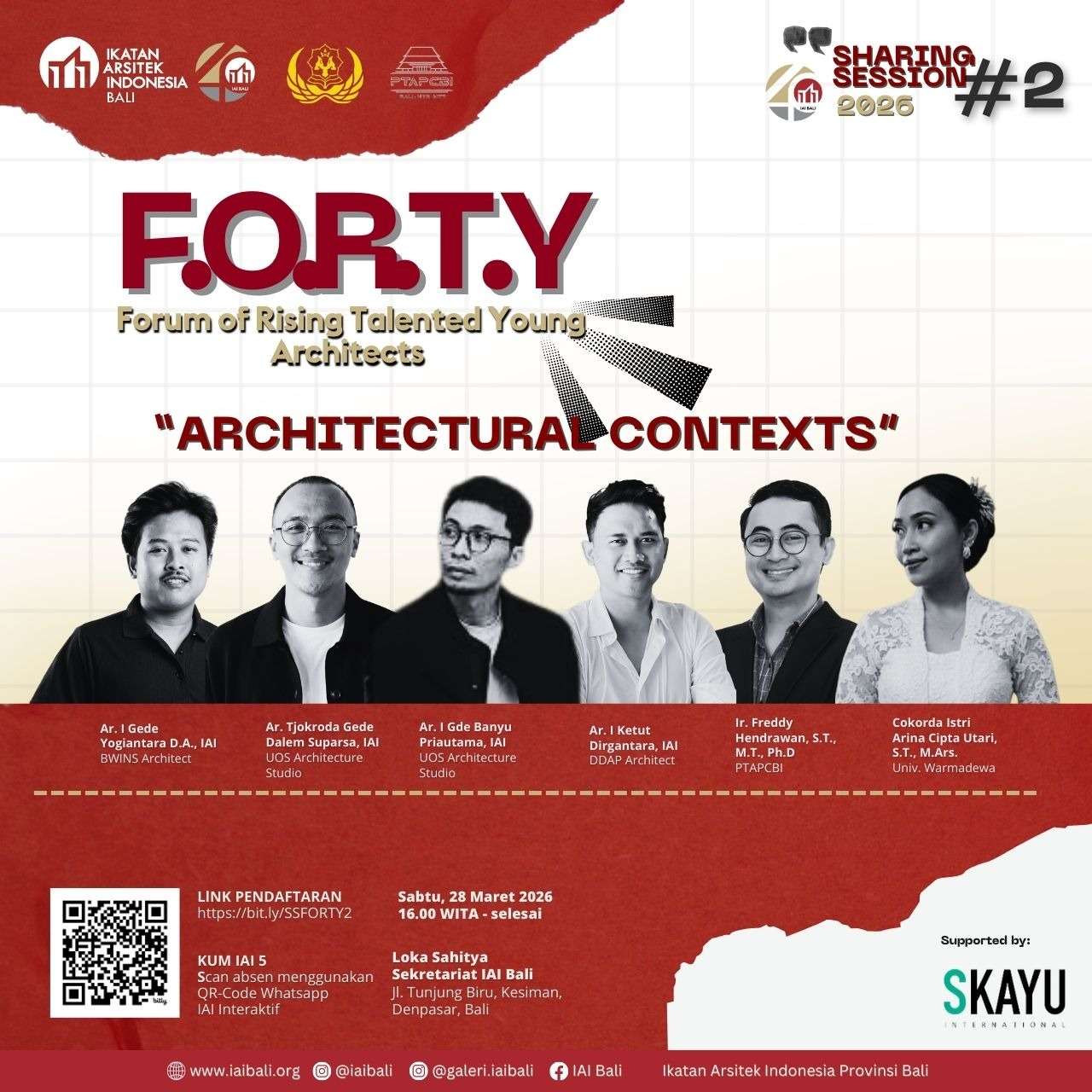 Sharing Session 2026 F.O.R.T.Y. (Forum of Rising Talented Young) Architect dirancang sebagai rangkaian forum inspiratif dan edukatif yang berlangsung sepanjang tahun 2026. Setiap sesi akan menghadirkan arsitek muda Bali atau yang berkarya di Bali sebagai narasumber utama. Empat narasumber akan diberikan waktu 40 menit presentasi, sesuai dengan semangat angka 40, yang merepresentasikan usia organisasi IAI Bali.