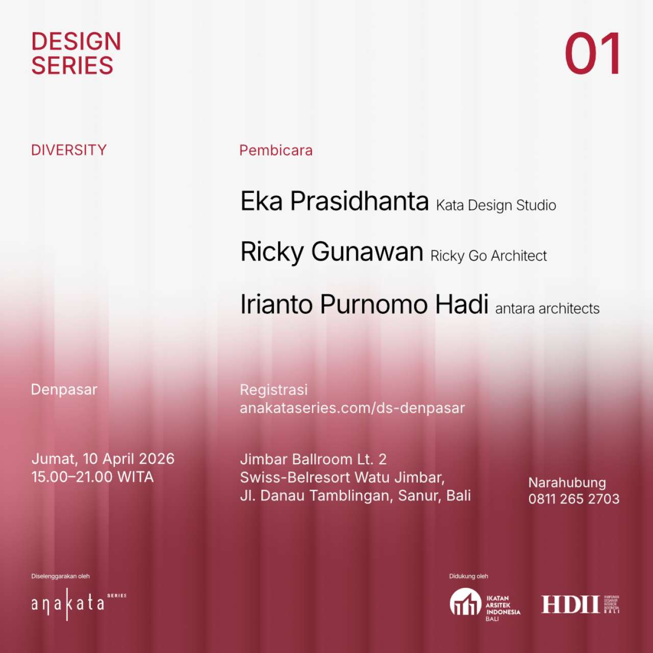 Nama Kegiatan : Design Series Denpasar Tanggal : Jumat, 10 April 2026 Waktu : 15.00 – 21.00 WITA Tempat : Sanur Resort Watujimbar Jl. Danau Tamblingan No.99A, Sanur, Denpasar Selatan