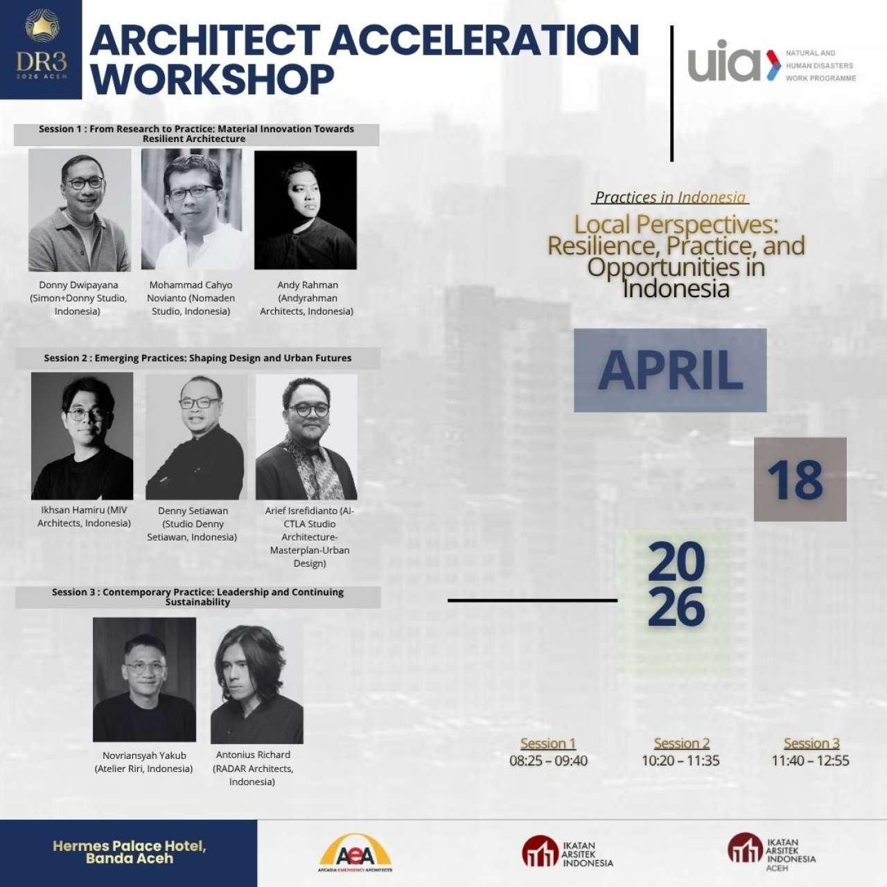 Workshop ini menyediakan platform yang reflektif sekaligus praktis untuk mengeksplorasi ketangguhan dari perspektif lingkungan, profesional, dan bisnis. Alih-alih hanya berfokus pada solusi teknis, sesi ini mendorong peserta untuk secara kritis menguji narasi-narasi dominan tentang ketangguhan sembari mengembangkan strategi untuk membangun praktik arsitektur yang adaptif, berkelanjutan, dan siap menghadapi masa depan. Dengan demikian, workshop ini juga menyoroti bagaimana para arsitek dapat menerjemahkan desain yang berorientasi pada ketangguhan menjadi layanan profesional dan peluang bisnis yang layak di dalam lingkungan binaan yang semakin tidak pasti dan berkembang dengan pesat.