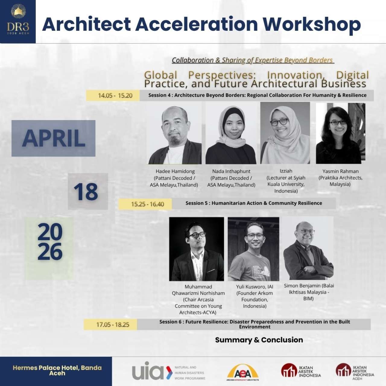 Workshop ini menyediakan platform yang reflektif sekaligus praktis untuk mengeksplorasi ketangguhan dari perspektif lingkungan, profesional, dan bisnis. Alih-alih hanya berfokus pada solusi teknis, sesi ini mendorong peserta untuk secara kritis menguji narasi-narasi dominan tentang ketangguhan sembari mengembangkan strategi untuk membangun praktik arsitektur yang adaptif, berkelanjutan, dan siap menghadapi masa depan. Dengan demikian, workshop ini juga menyoroti bagaimana para arsitek dapat menerjemahkan desain yang berorientasi pada ketangguhan menjadi layanan profesional dan peluang bisnis yang layak di dalam lingkungan binaan yang semakin tidak pasti dan berkembang dengan pesat.