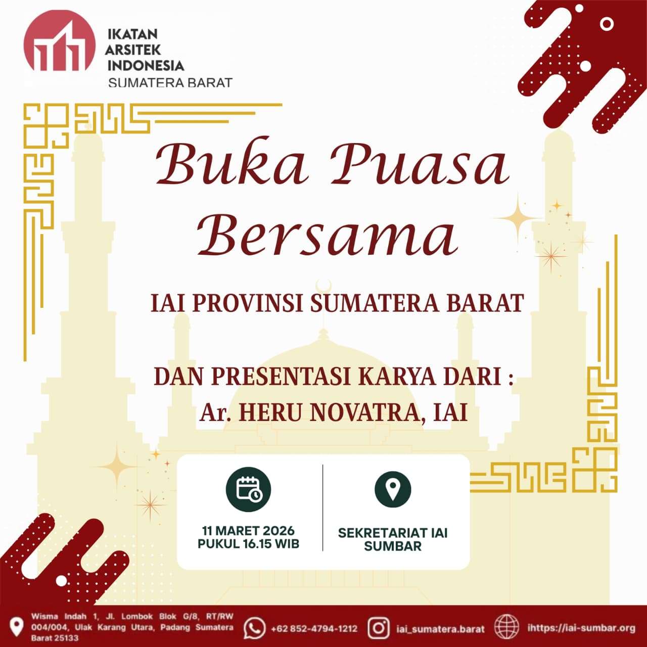 yang tepat untuk perbaikan diri dan mempererat tali silaturahmi. Salah satu upaya dalam mencapai hal tersebut. Ikatan Arsitek Indonesia Provinsi Sumatera Barat akan mengadakan buka bersama dengan anggota IAI, dan adanya presentasi karya dari anggota IAI Sumbar, yang mana ini akan menambah juga untuk sharing pengalaman dan bernilai kum bagi anggota yang hadir. kegiatan buka bersama ini cukup dibilang rutin setiap tahunnya yang diadakan di IAI Sumbar. selain Silaturahmi anggota juga dapat nilai kum serta sharing peangalaman.