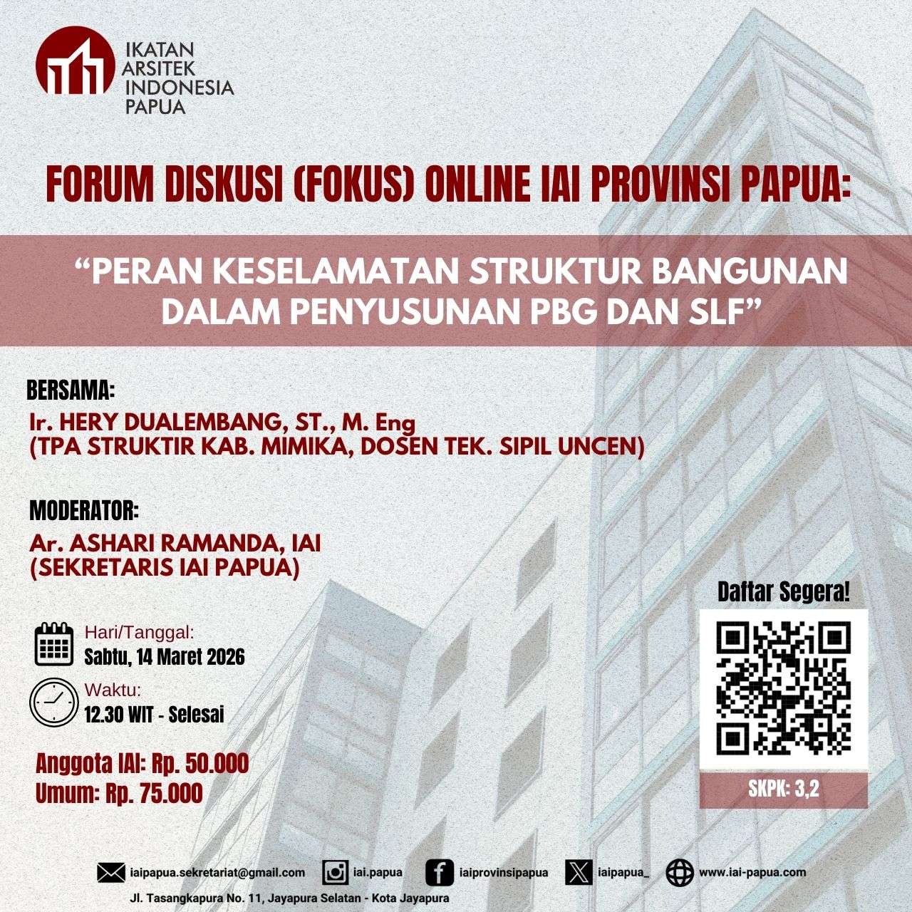 FORUM DISKUSI (FOKUS) ONLINE IAI PROVINSI PAPUA - Peran Keselamatan Struktur Bangunan dalam Penyusunan PBG dan SLF