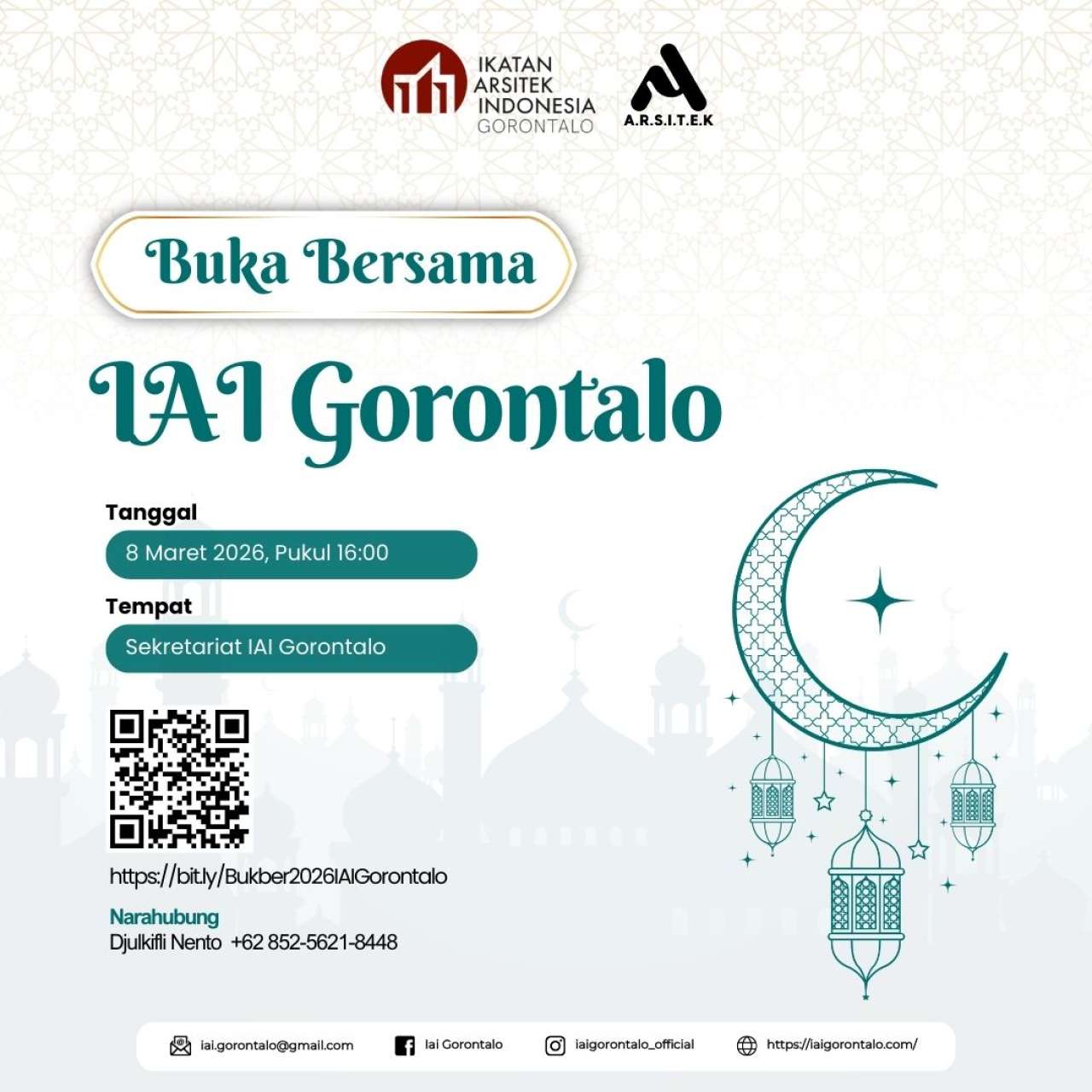 Kegiatan Buka Puasa Bersama Ikatan Arsitek Indonesia (IAI) Gorontalo Tahun 2026 merupakan agenda kebersamaan yang diselenggarakan dalam rangka mempererat silaturahmi antar anggota, pengurus, dan mitra kerja di bulan suci Ramadan. Acara ini dikemas secara sederhana namun penuh makna, diawali dengan tausiyah singkat, dilanjutkan dengan buka puasa bersama, serta ramah tamah. Kegiatan ini diharapkan menjadi momentum untuk memperkuat solidaritas, meningkatkan komunikasi, serta menumbuhkan semangat kebersamaan dan kepedulian dalam lingkungan organisasi.