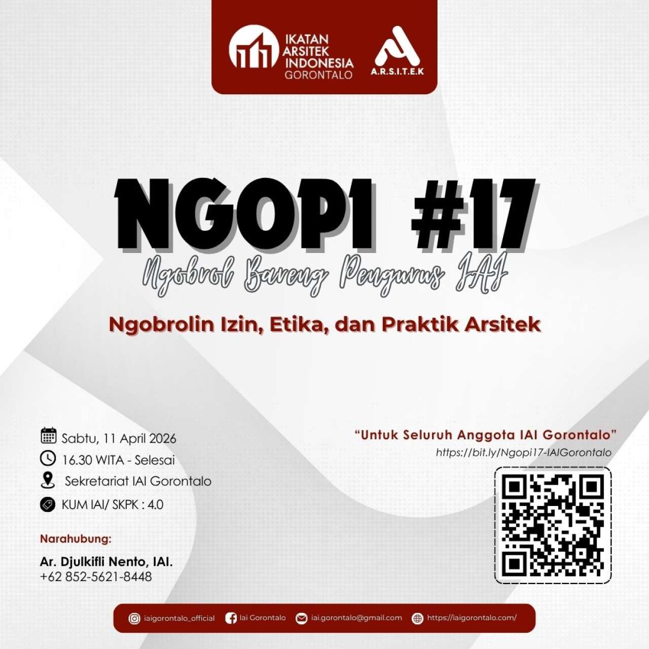 Kegiatan Ngobrol Bareng Pengurus Ikatan Arsitek Indonesia (IAI) Gorontalo #17 (Ngopi #17) merupakan forum diskusi santai yang mempertemukan pengurus dan anggota IAI Gorontalo untuk membahas isu-isu aktual dalam dunia arsitektur. Mengusung tema “Ngobrolin Izin, Etika dan Praktik Arsitek”, kegiatan ini fokus pada pemahaman proses perizinan seperti PBG, penerapan kode etik profesi, serta tata kelola praktik arsitek yang profesional.
