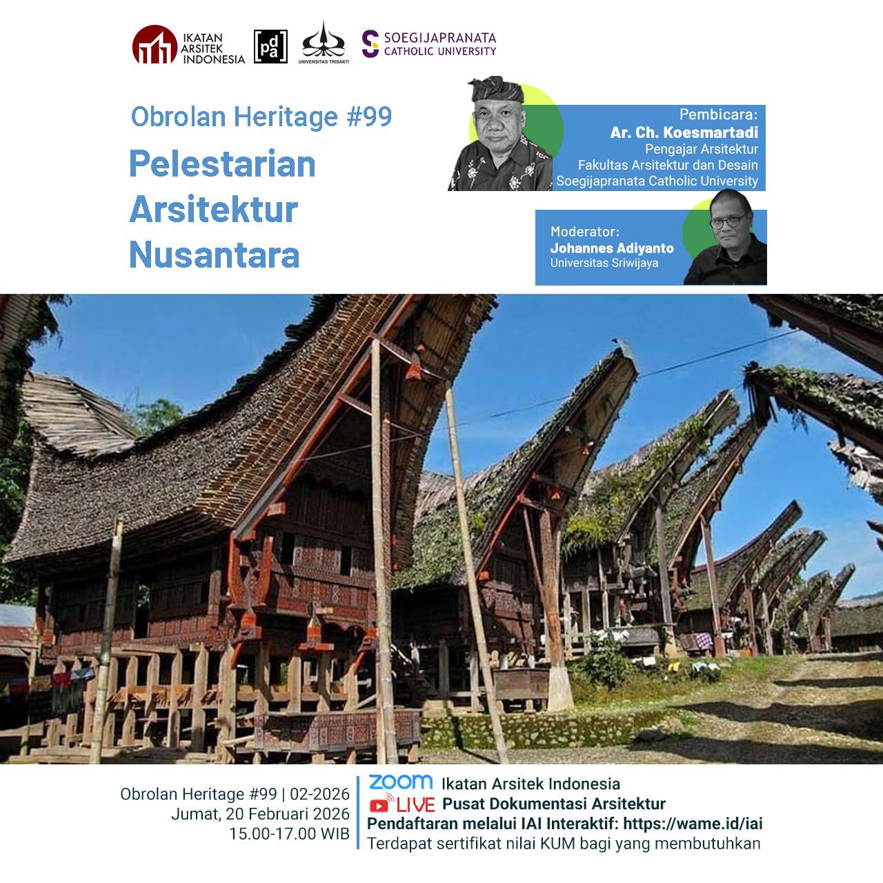 Indonesia merupakan negara beriklim tropis yang hanya memiliki dua musim, sehingga cenderung masuk ke kategori arsitektur pernaungan dibanding arsitektur perlindungan yang umum pada negara-negara empat musim. Perlunya perhatian lebih dari pemeran pelestarian terutama pada riset lapisan atap serta sistem pendukung desain mengingat cuaca, kondisi tanah, dan kerentanan bencana di Indonesia. Obrolan Heritage kali ini akan mencoba untuk mencari benang merah antara warisan arsitektur pernaungan Nusantara dan aplikasinya untuk saat ini. Diskusi akan diisi oleh Ar. Ch. Koesmartadi (Universitas Katolik Soegijapranata) dan dimoderatori oleh Johannes Adiyanto (Universitas Sriwijaya)