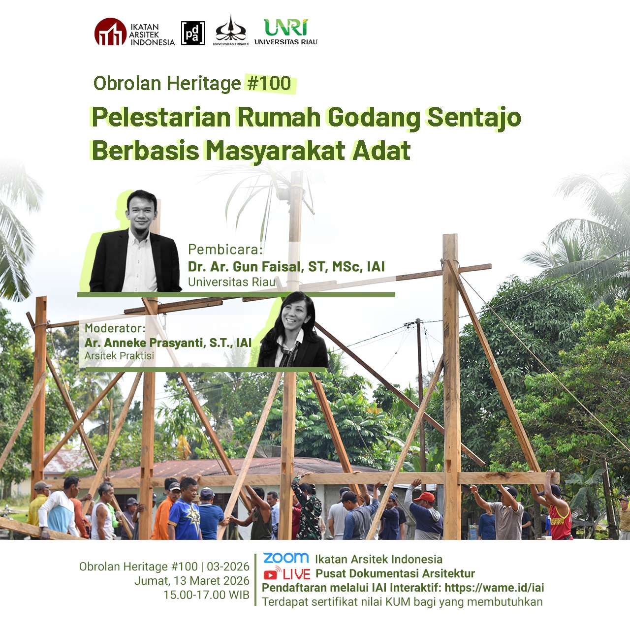 Obrolan Heritage ke-100 akan membahas bagaimana pelestarian berbasis masyarakat adat dapat menjadi strategi keberlanjutan arsitektur tradisional Nusantara—menghubungkan nilai tradisi dengan tantangan kontemporer.